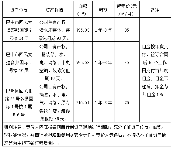 根據(jù)國有資產(chǎn)管理相關(guān)規(guī)定,巴中自然資源投資集團(tuán)有限公司決定對(duì)相關(guān)資產(chǎn)進(jìn)行公開招租。現(xiàn)將有關(guān)事項(xiàng)公告如下: